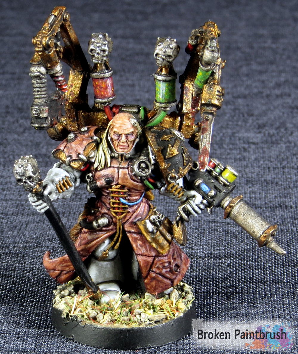 An oldie but a goody, Fabius Bile is a Games Workshop classic that I’ve had in my collection for over 15 years (crap that makes me sound old!). He has gone through a couple of iterations of paint schemes and his ‘enhanced’ warriors are back into bits pile in my closet, but I present the latest update to the classic. I wanted to pay some homage to his origins as a Emperor’s Children apothecary but still fit in with my Iron Warriors 14th Grand Company, so the armor was painted a dirty white and the shoulder pads black and silver. The flayed skin robe helps create the morbid color offset by the brightly colorful vials. I’ve seen Fabius Bile’s Chirurgeon used on so many crazy conversions for great reason: they are epicly gruesome. Between the chain blade, drill, butcher knife and syringe, it makes even a Ork Doc cringe. I wanted to give the backpack an old, worn look but still have it flashy as any Emperor’s Children would have it. Game wise, the newest edition of the codex …