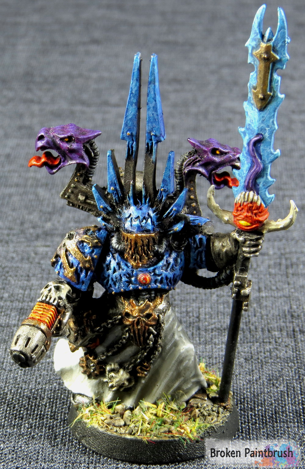 Haven’t picked up the brush much this week, so I figured I would post another of my older models. Timing is fitting considering I just finished my Mentor Legion Librarians. Another classic sculpt, this metal Chaos model painted up as Iron Warriors Sorcerer has been part of my collection for probably 15 years – crap that makes me feel old. Anyway, of all the four chaos deities, Tzeentch has always been my favorite both from a story and model perspective, so it was only fitting that the 14th Grand Company’s representative be of the Great Schemer’s ilk. It also adds a great way to experiment with additional colors in an otherwise drab looking army. I mean, no one picks the Iron Warriors for an army based on the cool, vibrant paint scheme. While I have itched the color bug over the years with the multitude of other armies, I always come back to my original favorite. Its also fun to come back to this classic sculpts as a reminder of how fantastic we have it now. …